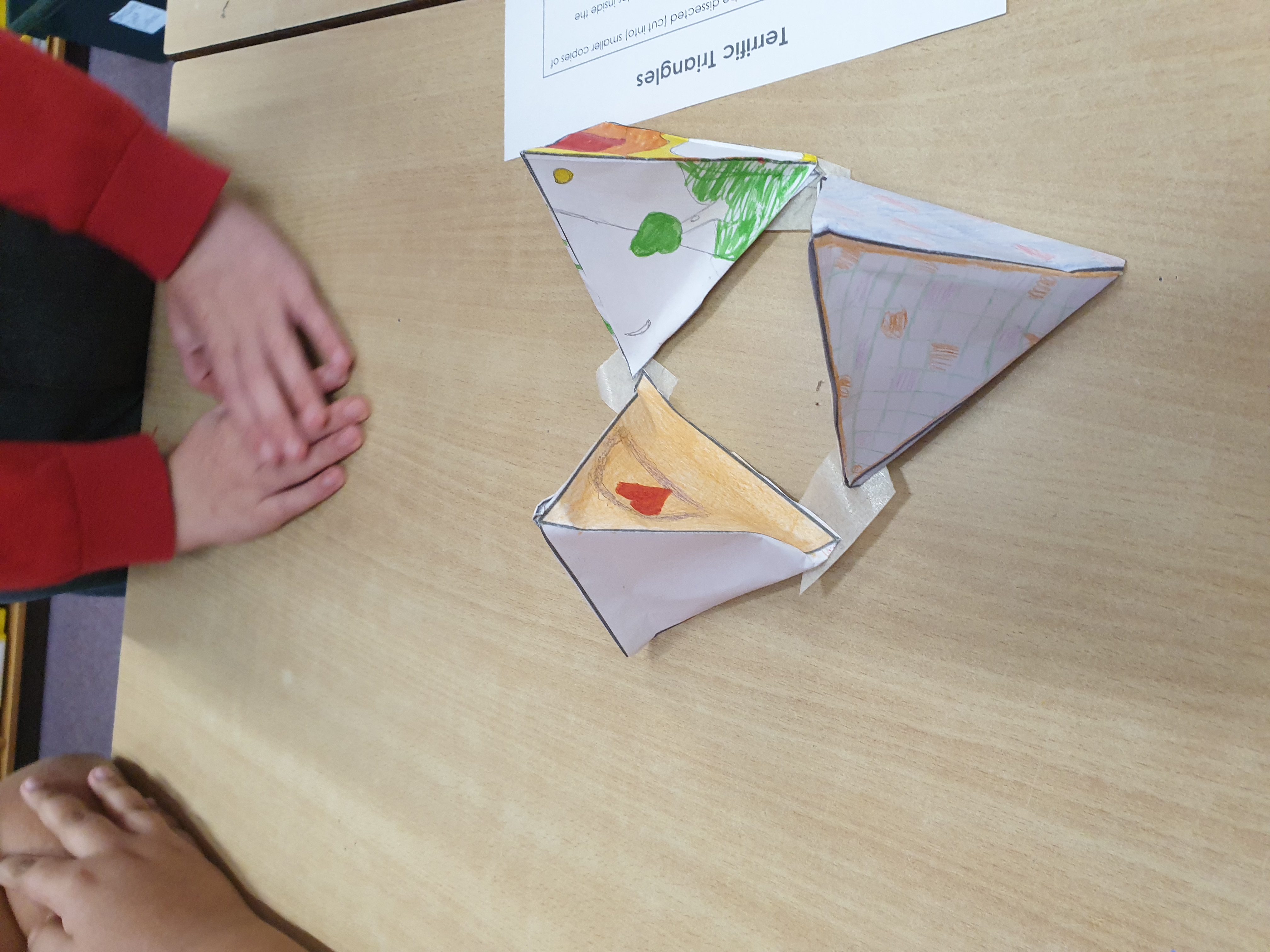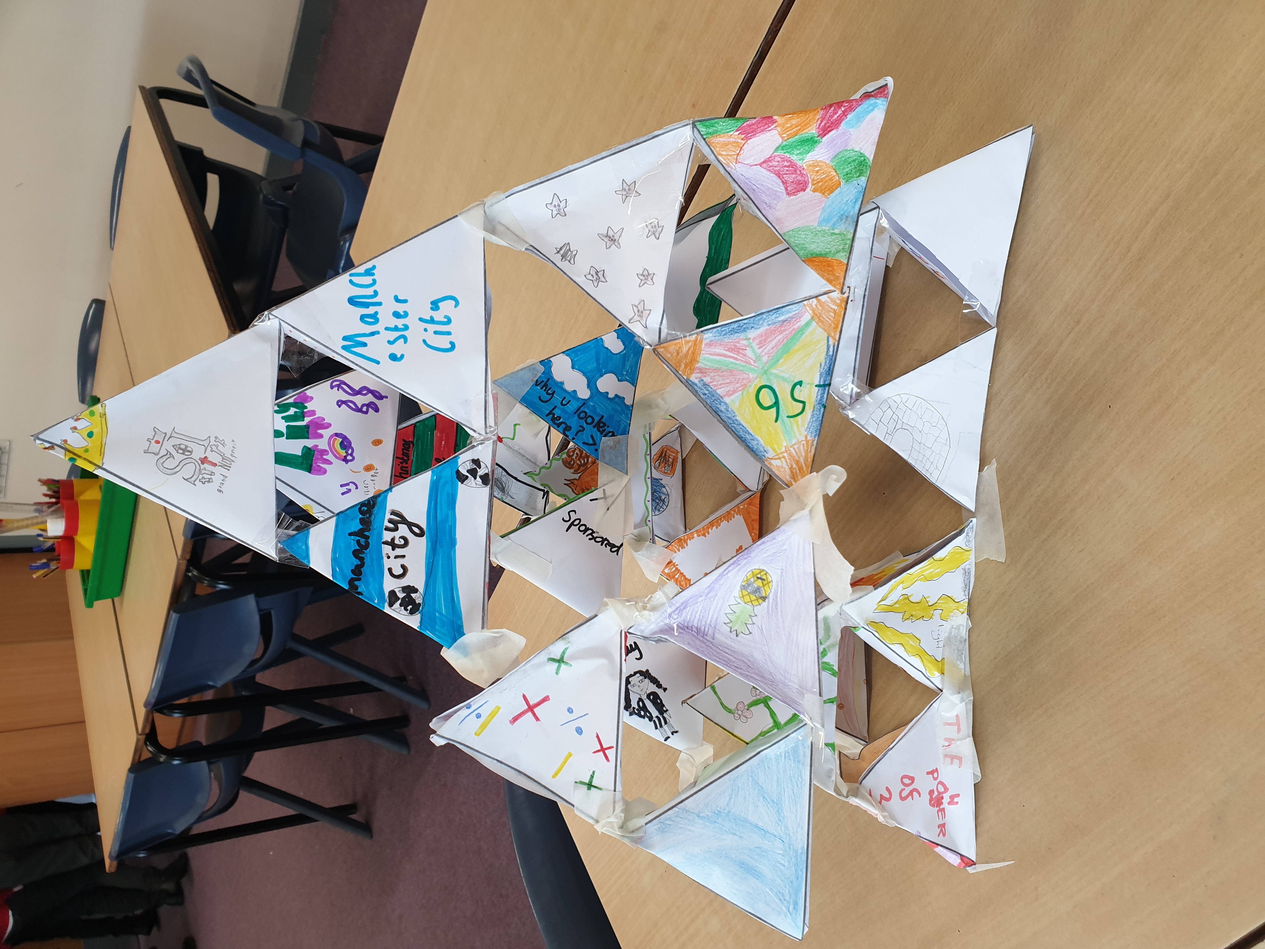 Year 5/6 built tetrahedrons and then madea a tetraTREEdon! We learnt that this is called fractal, which is making a shape using smaller versions of that shape.